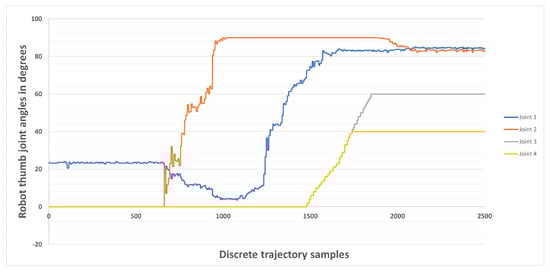 The robot thumb () joint angles cannot be evaluated in closed form. Therefore, an optimization−based inverse kinematics approach was followed using Equations (7)–(13) as presented in Algorithm 1.