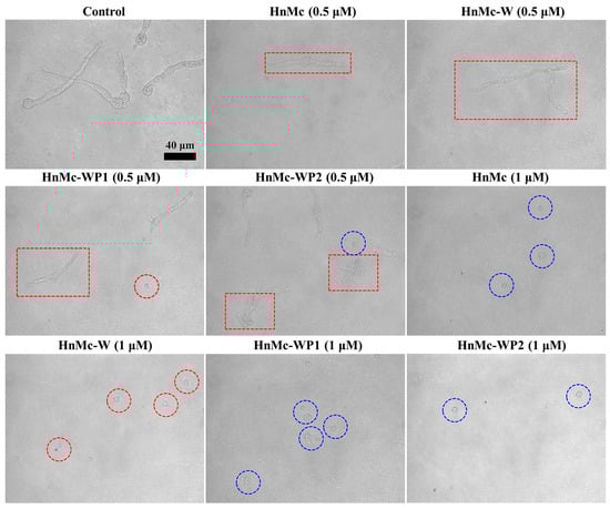 Alterations in the microscopic morphologies of C. gloeosporioides with peptides. Red dotted squares, red dotted circles, and blue dotted circles indicate the hollow hyphae, shrunken conidia, and swollen conidia, respectively.
