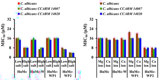 Salt tolerance effects of HnMc variants on antifungal activity. MIC90 is the minimum inhibitory concentration that inhibits fungal cell growth by 90%.
