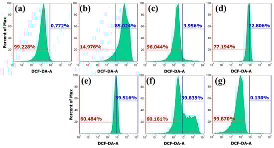 ROS generation of peptides in C. albicans CCARM 14007. Fungal cells were incubated without peptide (a) or with H2O2 (b), melittin (c), HnMc (d), HnMc-W (e), HnMc-WP1 (f), and HnMc-WP2 (g) for 6 h; stained with DCF-DA; and analyzed under flow cytometry.