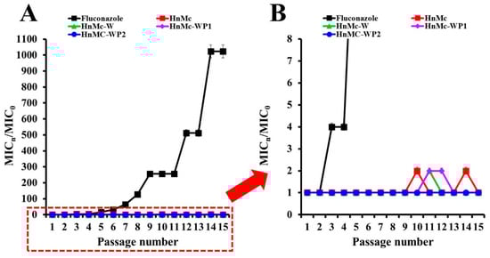Development of resistance to fluconazole or peptides in the presence of a sub-MIC in drug-sensitive C. albicans cells (A). The red dotted line part of (A) was enlarged (B). MIC0 and MICn are the values at zero and the number of passages, respectively.