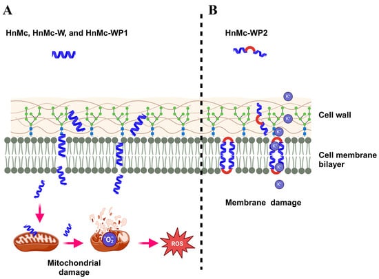In summary, HnMc and HnMc-W with straight alpha-helical structures and HnMc-WP1 with bent alpha-helical structures have similar fungal growth-inhibitory capacities and mechanisms of action. They penetrate the fungal cells by forming an alpha-helical structure in the fungal membrane, causing destruction of the mitochondrial membrane, generation of excessive ROS, and apoptosis (Figure 8A). However, HnMc-WP2, which has a ‘helix-to-helix’ structure, exhibited strong antifungal activity via its membranolytic action (Figure 8B). It is pointed out that its structure causes pore formation or permeation into the cell membrane rather than cell membrane penetration. In addition, because it can kill fungi within minutes by acting directly on the cell membrane, it can inhibit the development of peptide resistance as well as overcome drug resistance. Although further research is needed, including laboratory studies, on the relationship between the various structures of AMPs and their antimicrobial activities, it is clear that AMPs are promising next-generation antibiotics.