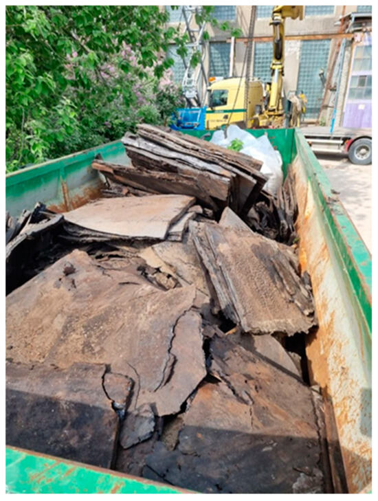 The roofing materials used in this study—including BBRM residues from renovation and demolition works, as well as SBS-containing BBRM strips cut from the edges of intact new panels during installation—were sourced from the construction company Katevara OÜ, located in Jõhvi, Ida-Virumaa, Estonia. The BBRM residues from renovation and demolition works originated largely from Soviet time (pre-1991) and consisted mainly of thick layers of bitumen and cardboard up to 40 cm (Figure 1) being in use and exposed to weather conditions for decades. For the sake of brevity, we will use the terms “old” BBRM and “new” BBRM. Both the BBRM waste from renovation and demolition works and SBS-containing BBRM strip waste from installation works were crushed into fragments approximately a few centimeters in size using a modified universal crusher OW-400.