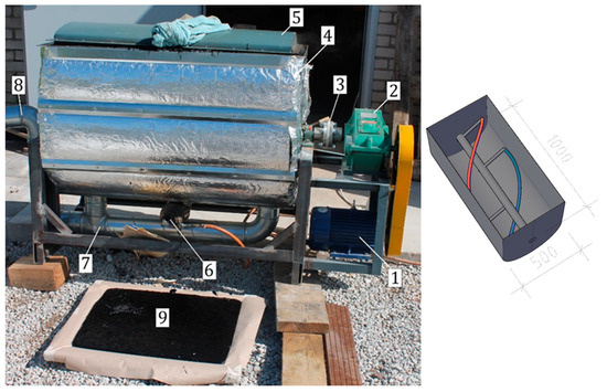 (Left): Photograph of experimental mixer. Position number markings are as follows: 1—three-phase asynchronous motor, 2—reduction gear 1:50, 3—thermal insulator, 4—insulated gas jacket hopper, free to rotate around the axle for emptying, 5—hatch, 6—gas burner with excess oxygen above stoichiometry, 7— exhaust piping, 8—chimney connection, coaxial with the mixer shaft to allow rotation of the hopper, 9—filled mold. (Right): High-torque agitator with a spiral beater made from round steel.
