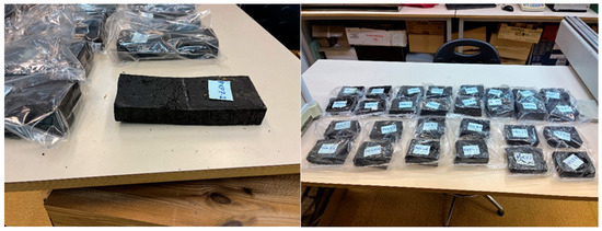 The mixture was heated with constant stirring at 200–250 °C until it melted or became a soft viscous mass. In the mixtures containing newer SBS containing BBRM, complete melting was not achieved. The molten or softened material was then transferred into metal molds that had been lined with baking paper or covered with a thin layer of silicone to prevent sticking. The surface of the composite was leveled, and the molds were allowed to cool to room temperature.