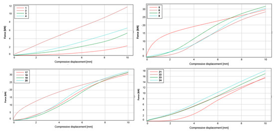 Compressive displacement of test series 1 (top left), 2 (top right), 3 (bottom left) and 4 (bottom right). The numbers shown in the legends are the identification numbers of the individual test specimens.