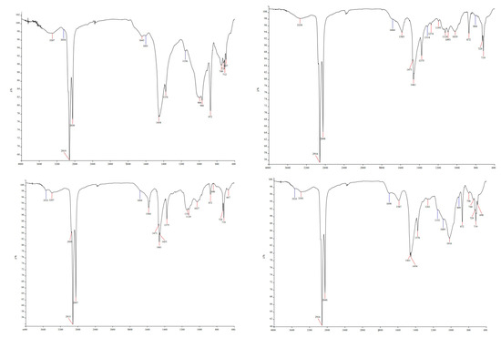 FTIR spectra of samples 1 (100% remelted “new” BBRM; (top left)), 2 (45% remelted “new” BBRM, 45% “old” BBRM, and 10% PE waste; (top right)), 3 (90% “old” BBRM and 10% PE waste, (bottom left)), and 4 (90% “new” BBRM and 10% PE waste, (bottom right)).