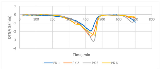 Samples were analyzed using a NETZSCH STA 449 F3 Jupiter® TG-DSC instrument (NETZSCH-Gerätebau GmbH, Selb, Germany). Samples were weighed into open Al2O3 crucibles and heated in a pure nitrogen (99.999 vol%) atmosphere at a nitrogen flow rate of 40 mL/min from room temperature to 700 °C, at a constant heating rate of 5 K/min. The sample mass used ranged from 3.5 to 7 mg. A total inert gas flow rate of 60 mL/min of nitrogen was used. To eliminate buoyancy effects, background mass data were recorded using an empty crucible experiment and subtracted from each of the sample measurement data sets. The results obtained are averages of the repeated measurements.