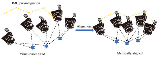 The illustration of the visual–inertial alignment. By matching the visual structure with IMU preintegration, the system estimates the gyroscope bias and calibrates IMU measurements.