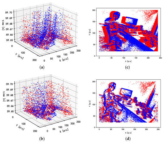 The differences between the distributions of the raw events and the motion-compensated ones (blue: positive events; red: negative events). The event camera moves freely and observes scenes of an office and a moving person. (a) shows the distribution of the raw events in the spatiotemporal space. (b) shows the event frame formed by the accumulation of raw events. (c,d) show the motion-compensated results corresponding to (a,b), respectively.