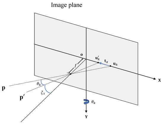 where denotes the coordinates of the center of the pixel plane, is the rotation matrix resulting from Z axis rotation, and is the two-dimensional translation vector resulting from rotation around the X axis and Y axis. The rotation matrix and the translation vector can be calculated as follows: