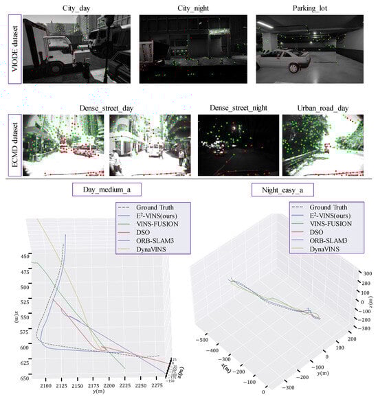 Visualization of some typical qualitative results. The weighted feature image frames obtained by -VINS on three test sequences from the VIODE dataset [42] (city_day, city_night, and parking_lot) and four sequences from the ECMD dataset [43] (Dense_street_day_easy_a, Dense_street_day_easy_b, Dense_street_night_easy_a, and Urban_road_day_easy_a) are shown on the upper side. Features with low weights (from dynamic objects) are plotted as red points, while features with high weights (from static objects) are shown as green ones. The trajectories of the compared algorithms and -VINS on the Dense_street_day_medium_a and Dense_street_night_easy_a sequences of the ECMD dataset [43] are illustrated on the lower side.