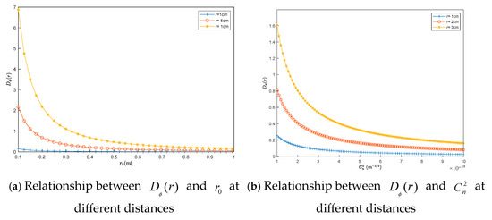 From Figure 2, it can be seen that, under the same turbulence intensity, as the distance between two points increases, continues to increase. When the distance between two points is fixed, decreases with the increase of and . When the fluctuation between two points is large, that is, the larger the , the smaller the , and the greater the degree of distortion.