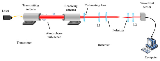The system schematic of this experiment is shown in Figure 3. The transmitter uses a solid-state laser with a wavelength of 532 nm, an output power of 200 mW, and a beam diameter of 5 mm as the light source. The laser emits the light source, which enters the atmospheric channel through the transmitting antenna (both the transmitting and receiving optical antennas are Maksutov optical telescopes with an aperture of 105 mm). At the receiving end, the signal beam is received by the receiving antenna and passes through a collimating lens into a 4F beam-reducing and -collimating system composed of L1 (focal length: 135 nm) and L2 (focal length: 75 nm). Two polarizers are added in the middle of the beam-reducing and -collimating system to attenuate optical power and filter out the strong light reflected by objects. A wavefront sensor is placed behind the L2 lens for wavefront detection, and the measured information is output to a computer to observe the wavefront phase of the beam.