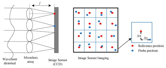 The principle of operation of the Shack–Hartmann wavefront sensor is shown in the Figure 4. The Shack–Hartmann wavefront sensor consists of a beam reduction system, a microlens array, and a CCD, and the incident pupil is separated into many sub-apertures by the microlens array. Each microlens focuses the parallel light incident on it onto the detection range of the CCD to form a spot array. If the incident wavefront is an ideal planar wavefront, the spot formed by each microlens will fall accurately at its focal point. If there is an aberration in the incident wavefront, the spot formed by each microlens will be off its focal point in its focal plane. The subaperture spot offset of the measured wavefront relative to the reference wavefront reflects the slope of the wavefront of the incident wavefront within the subaperture. By measuring the offset of each sub-aperture spot, the phase of the incident wavefront over the full aperture range can be recovered by a dedicated algorithm. From the working principle of the Shack–Hartmann wavefront sensor, it can be seen that the wavefront detection accuracy of the Shack–Hartmann wavefront sensor mainly depends on the center-of-mass detection accuracy of each sub-aperture in the spot array. And the magnitude of the wavefront aberration is related to the degree of deviation. In Figure 4, Δx and Δy are the offsets from the center reference point in the x and y directions respectively.
