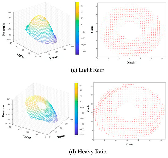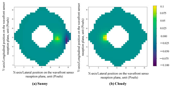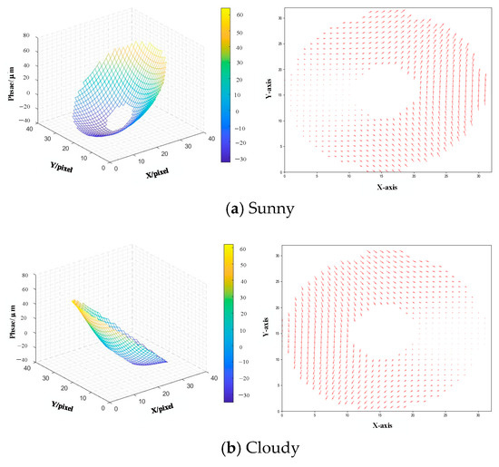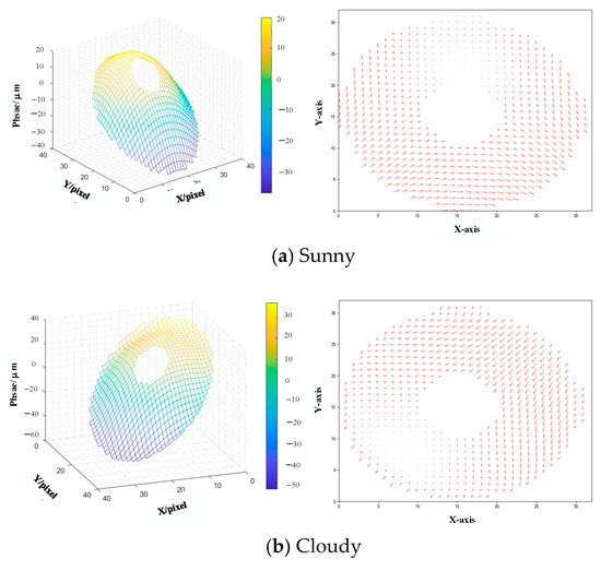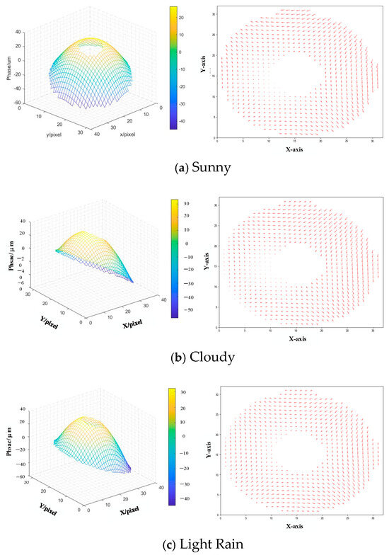 Here, , and represent the second and first partial derivatives of the wavefront phase matrix , respectively, where and are the indices of the valid elements in the matrix rows and columns. The Gaussian curvature distribution map is drawn by calculating the measured data using Equation (18), and the wavefront distortion under different weather conditions is analyzed.