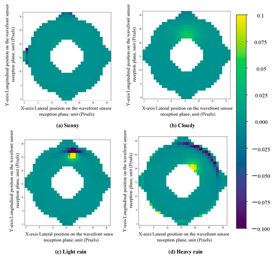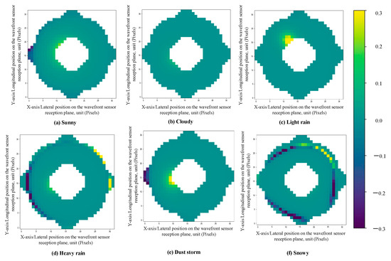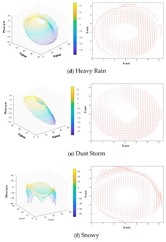 It is evident that, in Figure 10d (heavy rain) and Figure 10f (snowy conditions), the regions with the most significant local distortions are mainly concentrated at the edges, whereas in other weather conditions, they are concentrated in the central region. From Figure 10a, the Gaussian curvature map under sunny conditions shows a relatively uniform distribution, with slight fluctuations in the central region, but overall, there is little change. The wavefront distortion is relatively minor, indicating that atmospheric turbulence has a minimal impact on the wavefront under sunny conditions. In Figure 10b, the Gaussian curvature distribution under cloudy conditions shows little change compared to Figure 10a (sunny), remaining relatively uniform. This indicates that wavefront distortion is also minimal under cloudy conditions, similar to sunny conditions, with a minimal impact from atmospheric turbulence. In Figure 10c (light rain), the distribution is similar to that in Figure 10a,b (sunny and cloudy), but with increased curvature in the central region, as indicated by brighter central spots. This suggests that wavefront distortion increases under light rain compared to sunny and cloudy conditions. In Figure 10d (heavy rain), the Gaussian curvature map shows significantly increased fluctuations in the central region, indicating stronger wavefront distortion. The edge regions also show marked fluctuations, with distinct negative curvature areas. Heavy rain causes strong turbulence and scattering effects, significantly impacting wavefront quality. In Figure 10e (dust storm), the Gaussian curvature map exhibits significant local fluctuations, particularly in the central part of the image. Wavefront distortion is more pronounced under dusty conditions, likely due to the atmospheric dust particles causing more noticeable wavefront aberrations. In Figure 10f (snowy conditions), the Gaussian curvature map shows strong fluctuations, particularly more pronounced at the image edges, with regions of both positive and negative curvature peaks. The wavefront distortion is significant. The Gaussian curvature map reveals an uneven distribution, with changes in snowflakes causing numerous disturbances in the optical path, affecting wavefront smoothness.