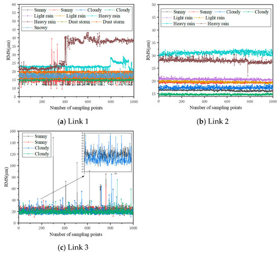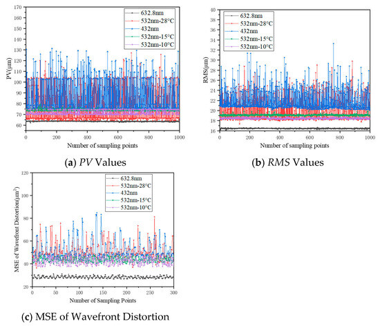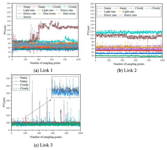 The PV value of the wavefront only indicates the maximum defect level of the wavefront, without considering the proportion of this defect in the whole wavefront. Therefore, evaluating wavefront quality based solely on the PV value is not rigorous enough. In contrast, the RMS value of the wavefront emphasizes the overall information of the wavefront, reflecting the deviation of all points from their ideal positions. Thus, combining both metrics provides a more accurate representation of the wavefront condition. Figure 8 and Figure 9 present the PV and RMS values of the wavefront for three links, measured with 1000 sampling points.