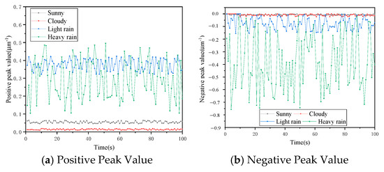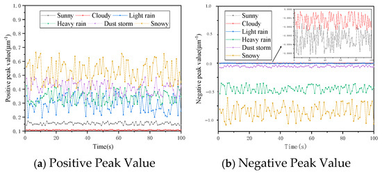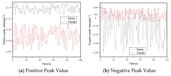 The positive and negative peak values represent the local or global maximum positive and negative values of Gaussian curvature at that point or region, indicating significant changes in the wavefront in that area but in opposite directions. Both represent local changes in the wavefront surface. A positive peak value indicates that the wavefront surface at that point or region exhibits a strong convex characteristic, meaning the wavefront is bending outward at that point. The positive peak value indicates an enhancement in the convex characteristic and a positive change in the phase. A negative peak value indicates that the surface at that point or region exhibits a strong concave characteristic, meaning that the wavefront bends inward in one principal direction and outward in the other [16]. The negative peak value indicates an enhancement of the concave characteristic and a negative change in phase. After calculating the Gaussian curvature for each point using Equation (18), the maximum value (positive peak) and minimum value (negative peak) of Gaussian curvature are found by traversing all of the points. Figure 13, Figure 14 and Figure 15 show the positive and negative curvature peak values over 100 s under different weather conditions for the three links.