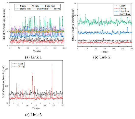 Based on Figure 16 and Table 9, Table 10 and Table 11, in link 1, the MSE of the wavefront distortion fluctuates relatively little under sunny and cloudy conditions, indicating more stable wavefront quality. In contrast, the MSE fluctuates more under light rain, heavy rain, dust storm, and snowy conditions, with the mean values for dust storm and snowy conditions being close, but the standard deviation is higher under dust storm conditions, indicating greater variability than under snowy conditions. Particularly under heavy rain, the MSE of wavefront distortion reaches a maximum of 101.67 μm2, a minimum of 43.17 μm2, and a standard deviation of 13.13 μm2, which are significantly higher than under other weather conditions, indicating that severe weather has a substantial impact on wavefront quality. The magnitude of the MSE of wavefront distortion decreases in the following order: heavy rain, dust storm, snowy, light rain, sunny, and cloudy conditions.