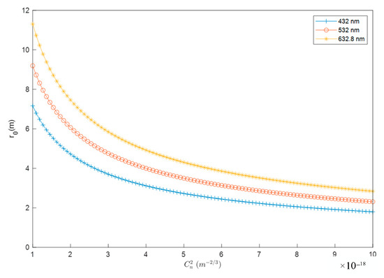 The Fried parameter is an important parameter used to describe the impact of atmospheric turbulence on optical wavefronts, also known as the atmospheric coherence length. It is typically denoted by , representing the scale of the relatively uniform region through which a light beam propagates in the atmosphere. Specifically, the larger the Fried parameter, the smaller the wavefront distortion. Conversely, the smaller the Fried parameter, the greater the wavefront distortion. According to Equation (15), the relationship between and under different wavelength conditions is derived.