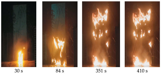 Figure 21 illustrates Condition 2-2, where the ignition point is located in the middle of the building under a backward wind (west wind). The flame deflection is shown. From the flame images at 12 s and 60 s on the fire-exposed wall, it can be observed that the backward wind primarily promotes the upward spread of the flames during the initial burning stage. Subsequently, as the burning progresses, the flames begin to noticeably shift to the right. The images at 130 s and 270 s show that the combustion under this wind field occurs mainly in the upper right corner of the fire-exposed wall. Additionally, from the flame spread images on the right side wall, it is evident that at 112 s, the insulation material on the right side is ignited by the flames from the upper right corner of the fire-exposed wall. The fire then starts spreading downward, burning to the middle of the right side wall. Later, under the influence of the wind field, the fire on the right side wall is extinguished at 362 s, and the fire on the fire-exposed wall gradually extinguishes at 450 s.