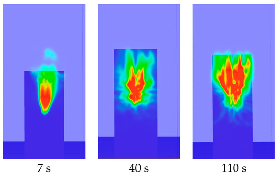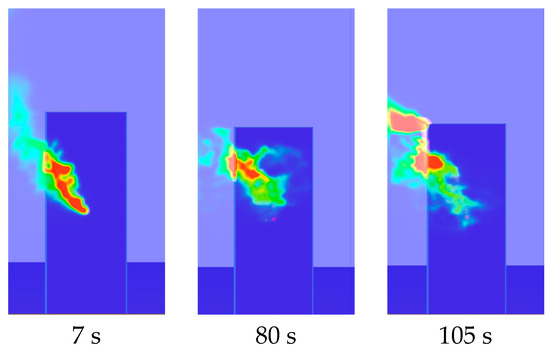 Figure 18 illustrate the flame deflection under Condition 1-1 (the red part in the cloud map is the flame, and all the cloud maps below are the same), where the ignition point is located at the bottom of the building with a forward wind (east wind). The flames on the fire-exposed wall spread rapidly upward under the influence of the forward wind and also diffuse to the sides of the fire wall. By 170 s, the insulation material on the entire fire-exposed wall is ignited and spreads to the left and right side walls. At 67 s, the flames spread to the right wall, igniting the insulation material on the right side wall from the middle of the building. By 145 s, the insulation material on the upper middle part of the left wall is also ignited. The forward wind facilitates both the vertical and horizontal spread of the flames.