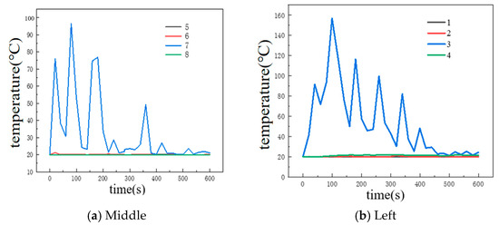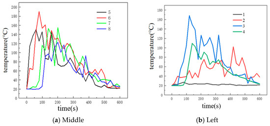 Figure 31 shows the temperature changes near the fire-exposed wall under Condition 1-1. It can be seen from the figure that under the influence of the forward wind, except for the thermocouples located at the lower left and lower right corners of the fire-exposed wall, which show no temperature change, the temperatures of the remaining thermocouples on the fire-exposed wall exhibit significant increases and fluctuations. This indicates that the forward wind causes the flames to fully spread across the fire-exposed wall above the ignition point. The thermocouples at various positions experience a rapid increase in temperature during the first 100 s, which corresponds to the full development stage of the flames, also suggesting that the forward wind promotes the development of the fire on the fire-exposed wall.