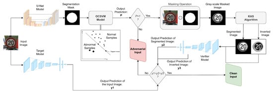 Therefore, a comprehensive defense technique that restricts these image space manipulations is crucial to secure the autonomous driving environment and mitigate the threat of adversarial attacks on such critical systems. Existing defense mechanisms against adversarial attacks face challenges such as limited generalization, e.g., when using adversarial training [22,23], high computational costs, e.g., when using Generative Adversarial Networks (GANs) [24], and reduced effectiveness against certain adversarial attacks [25]. To this end, we propose a novel adversarial detection method based on image segmentation techniques that can be easily added to any DNN model, thus making the detection method model agnostic. Also, the proposed detection method does not need prior knowledge of any adversarial algorithms as opposed to adversarial training; therefore, it is adversarial-knowledge agnostic. The proposed pipeline mitigates the adversarial effect by checking the segmentation mask patterns of the input images and classifying their salient features while neglecting non-structural ones. Our approach begins by extracting the segmentation mask of the input image using a U-net model and then feeding it into a one-class Support Vector Machine (SVM) to verify if it matches legitimate patterns of the segmentation masks. This is the first line of defense. Next, the object of interest is isolated using the segmentation mask, and a proposed segmentation algorithm based on k-means dynamically segments the masked image into several regions preserving its structural features. The segmentation algorithm generates two versions of the input image: a segmented image and an inverted one. Both versions are classified by a verifier model, that is, a DNN model different from the main one. The predictions are then compared to the original input prediction of the target (main) model for the final decision. The verifier model with the segmentation algorithm is the second line of defense.