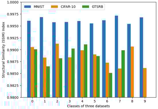 This bar chart shows the Structure Similarity Index (SSIM) of the test set images for each class of the MNIST, CIFAR-10, and GTSRB-8 data sets before and after applying the KAS algorithm at .