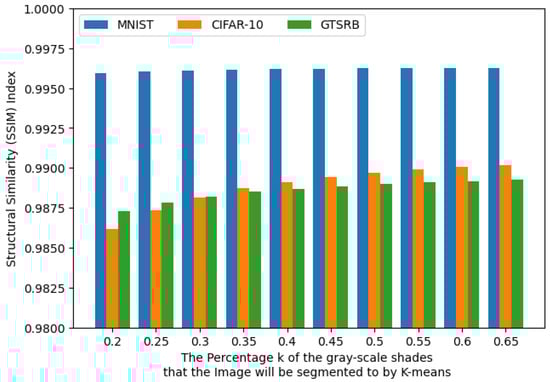 SSIM index of the test set images of all classes of MNIST, CIFAR-10, and GTSRB-8 data sets before and after k-means procedure at 10 values of k.