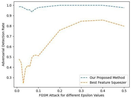 The detection rates of our proposed method as compared to the best feature squeezer for the FGSM attack on the GTSRB-8 data set with values to . This figure shows the superiority of our method for all values.