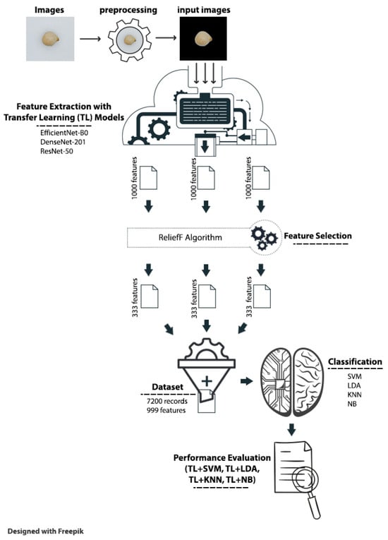 In this study, four different hybrid models have been developed, and a novel dataset has been created. The dataset includes pre-processed images of eight different chickpea types. ResNet-50, EfficientNet-B0, and DenseNet-201 models are used to extract features from the images. Then, the most relevant features have been selected by ReliefF algorithm. The selected features have been fed into the classifier, for example, Support Vector Machine (SVM), K Nearest Neighbor (KNN), Linear Discriminant Analysis (LDA), and Naïve Bayes (NB). Each hybrid model has been called “TL + classifier name”, where TL stands for transfer learning. The performance of the models has been evaluated using accuracy, recall, F1-score, precision, and AUC metrics. Figure 1 illustrates the sequential steps of this research. Each task is elucidated step by step in this section.