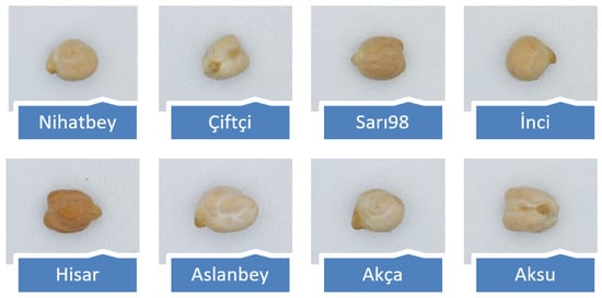 Chickpeas, the second most consumed legume crop in the world, are cultivated in over 50 countries [39]. They are rich in proteins, vitamins, fiber, and minerals and comprise a high-quality food resource that benefits human health [40,41]. This research, addressing chickpea classification, has conducted experiments on the original dataset named “TRCS_8_SET”. The dataset we created is available at https://github.com/ibrahimkilic/TRCS_8_SET/ [42] (accessed on 31 December 2024). Our dataset includes images (captured in three different directions) of eight different chickpea types registered in Türkiye (visible in Figure 2). These are called Nihatbey, Çiftçi, Sarı98, İnci, Hisar, Aslanbey, Akça, and Aksu.