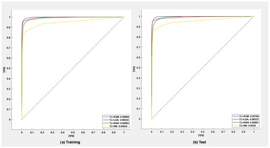 As can be observed, the TL+SVM and TL+LDA models outperformed the other hybrid models in terms of training and test accuracy rates. Figure 4 presents four hybrid models’ performance on training and test data in terms of AUC values. In the training phase, the AUC value of TL+SVM is the highest, reaching about 0.997, followed by TL+LDA (0.995), TL+KNN (0.9898), and TL+NB (0.946). In the test phase, again, the highest AUC value was produced by TL+SVM (about 0.998) and the lowest AUC value by TL+NB (0.952). These results indicate that TL+SVM has the highest predictive ability.
