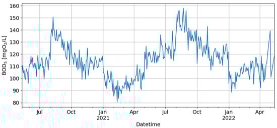 The duration of the experimental phase was 24 months. The data obtained during the experiment are described in Section 2.4. The primary regulated characteristics of the setup included the concentration of dissolved oxygen across different zones (DO, mg/L), hydraulic retention time (HRT, hours), and mixed liquor-suspended solids (MLSS, mg/L). The sludge retention time (SRT) was maintained at 20 days. The MLSS concentration was adjusted by regulating the return-activated sludge flow, which allowed for a constant biochemical oxygen demand (BOD5) loading of 0.2 g/g/d, as required by the experimental conditions. In accordance with the BOD5 concentration in the incoming wastewater, the dissolved oxygen levels in the individual bioreactor zones were also adjusted. In the first zone (A), the oxygen concentration varied from 0.1 mg/L to 0.5 mg/L, while in the second zone (B), it ranged from 0.35 mg/L to 0.8 mg/L. The HRT varied between 6.5 h and 12 h. The flow rate in the oxidation ditch was maintained at 0.2 m/s. A detailed description of the setup can be found in a previous study [36]. The primary focus of this research is the analysis of time series data reflecting the changing concentration of biochemical oxygen demand (BOD5, mgO2/L).