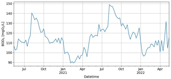 Figure 4 illustrates the values of BOD5 after resampling. The resampling was conducted using the weekly average, which facilitates the interpretation of the timeline.