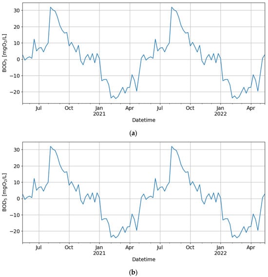 Characteristics of the timeline: (a) trend of BOD5 values over time after resampling; (b) seasonal component of BOD5 values over time after resampling.