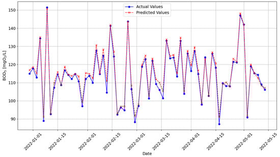 The performance of these models was consistent. The identified prediction errors were significantly lower than the actual error of the analytical method for determining BOD5, which has a relative error of 9% in the concentration range of 100 to 300 mg/L. The best results were achieved by the ARIMA–LSTM architecture, which effectively accounted for various types of dependencies. Notably, the LSTM model alone also demonstrated high performance and could be used without the ARIMA component, reducing resource consumption. The literature supports the effectiveness of LSTM modeling for predicting values in time series related to the quality of incoming wastewater [19,20,30,44].