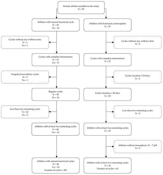 Empty cycles, where all data were missing, were excluded from further analysis. Irregular cycles, defined when their duration was shorter than 21 days or longer than 35 days [20], anovulatory cycles (among those measured), and atypical HC use, defined when the duration was not equal to the 28 days of a pill pack, were removed. Only athletes with at least two uninterrupted full cycles with complete wellness data were retained.