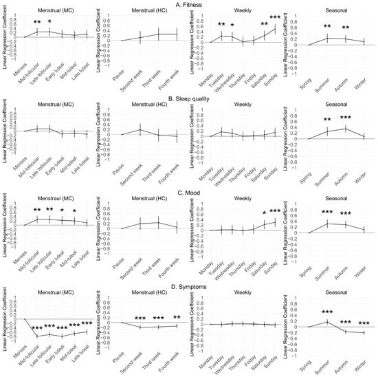 Menstrual, weekly, and seasonal variations for each fitness (A), sleep quality (B), mood (C) score, and number of symptoms (D) for all athletes. * p < 0.05, ** p < 0.01, *** p < 0.001.