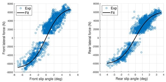 To properly model tyre forces, experimental data are fitted with the tyre model presented in Section 2. Considering the equations of a single track model, front and rear lateral forces are computed by inverting the equations of motion (1) and (2):