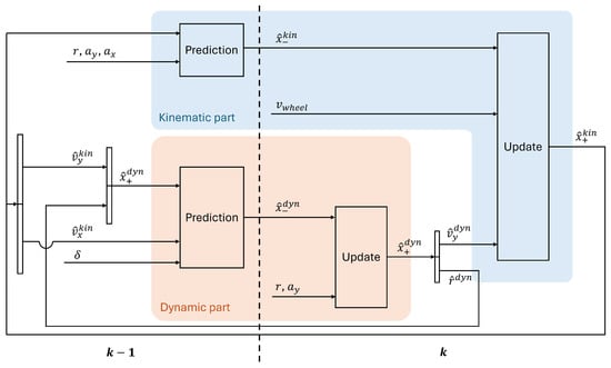 To exploit the potential and reduce the impact of weaknesses of both methods, a combined dynamic–kinematic EKF approach is proposed. Figure 3 shows a schematic of the combined algorithm. Estimated quantities are distinguished from measured ones by the use of circumflex and the subscript meas is dropped for the sake of clarity. Both dynamic and kinematic parts have a prediction block—fed with measurements at step —and an update block—fed with measurements at step k. The lateral velocity estimate resulting from the dynamic EKF is used as an additional measurement for the update of the kinematic estimation part. Consequently, the measurement equation of the kinematic model becomes the following: