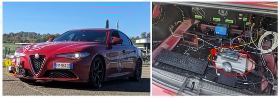 The combined EKF is validated in a test campaign, conducted at the Mugello Circuit proving ground (Italy). The test vehicle is an Alfa Romeo Giulia, shown in Figure 4. All relevant vehicle parameters are listed in Table 1. The case study instrumentation featured on the vehicle is (Figure 4) as follows: