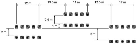 The slalom test is performed at 60 km/h. The manoeuvre consists of going around ten cones at a distance of 20 m between each other []. The geometry of the slalom test is outlined in Figure 6. To mark the beginning and end of the manoeuvre, the vehicle must pass through two cones at a distance of 10 m from the first and last cones of the slalom. The manoeuvre is performed at constant speed.