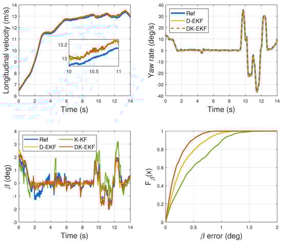 Figure 8 also shows the estimation of the yaw rate computed by D-EKF and DK-EKF, compared to the signal of the measured one. Both Kalman filters significantly rely on the measured yaw rate, since the variance of the sensor noise is rather low. The K-KF is not displayed, since it directly uses the measured signal, shown as reference yaw rate. The sideslip angle estimate is presented in the bottom-left plot. The D-EKF is able to predict the general behaviour of , but it is not precise. The K-KF estimation is affected by a drifting behavior, but it is better at capturing the high-frequency features of the reference sideslip angle. The DK-EKF corrects the dynamic part and is closer to the reference. Moreover, the kinematic part does not lead to diverging results, thanks to entering as a measure. Table 2 reports a comparison of the root mean square error (RMSE) of the estimations, highlighting the higher performance of the DK-EKF, with respect to both D-EKF and K-KF. The cumulative distribution function of the estimation error of , , is also shown in the bottom-right plot of Figure 8. expresses the probability that the estimation error of remains below a certain value x, namely . This metric clearly shows that DK-EKF outperforms both D-EKF and K-KF, with the latter returning the least reliable estimation.