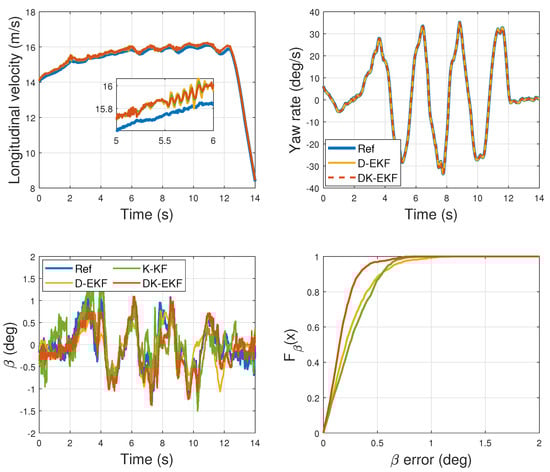 Figure 8 shows the results of a DLC at 50 km/h. The estimated longitudinal velocity is shown in the top-left plot. For the D-EKF, is not an output of the extended Kalman filter, but it is computed from Equation (5). The three estimations are very similar and close to the reference value (the maximum error is lower than 0.15 m/s), even if all three tend to slightly over-estimate . This is due to the averaging of the longitudinal velocities from the four corners, that do not account for longitudinal slips.