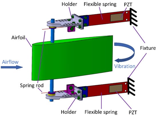 In airfoil-based flutter piezoelectric energy harvester systems, when the airflow velocity exceeds a critical threshold, aeroelastic coupling induces flutter motion characterized by coupled plunge–pitch oscillations. Based on this fundamental principle and the structural designs reported in [28,29], we designed a novel energy harvesting system, as illustrated in Figure 1. The proposed system consists of several key components: an airfoil-based structure for aerodynamic force capture, a rotating pitch mechanism enabling controlled pitch motion, two fixed brackets for structural support, and dual elastic beams that facilitate plunge motion through their bending deformation. The system’s restoration mechanism is achieved through two spring rods connecting the rotating pitch component to the brackets, while energy conversion is accomplished by two PZTs mounted on the elastic beams. The material properties and structural dimensions of all components are listed in Table 1.