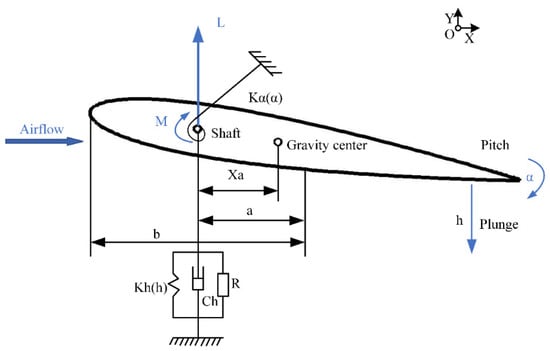 where is the longitudinal force, positive in the upward direction, is the moment, positive in the counterclockwise direction, and is the sudden displacement, positive in the downward direction; α represents the pitch displacement, positive in the clockwise direction; represents the total mass, including the airfoil-based components, plunge spring, spring rod, and holder; denotes solely the mass of the wing; is the mass moment of inertia about the elastic axis. and are the damping coefficients of the pitch and roll degrees of freedom, respectively; and represent the linear structural stiffness coefficients associated with the pitch and roll degrees of freedom, respectively; and represent the linear structural stiffness coefficients related to the cubic nonlinear pitch and roll degrees of freedom, respectively; is the harvester electromechanical coupling term; represents the external load resistance connected to the piezoelectric sheet of the collector; is the output voltage generated by the external resistor; represents the capacitance of the piezoelectric sheet; is the mass moment of the airfoil-based body about the rigid center; represents the half chord of the airfoil-based -based; denotes the dimensionless offset of the airfoil-based elastic axis measured from the half chord; is the dimensionless distance from the center of gravity to the elastic axis.