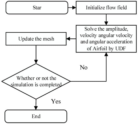 As depicted in Figure 3, the solution process proceeds as follows: (1) initialize the flow field; (2) use UDFs to calculate amplitude, velocity, angular velocity, and angular acceleration; (3) update the dynamic mesh; (4) when the calculation is completed, return to step (2) until the calculation is completed.
